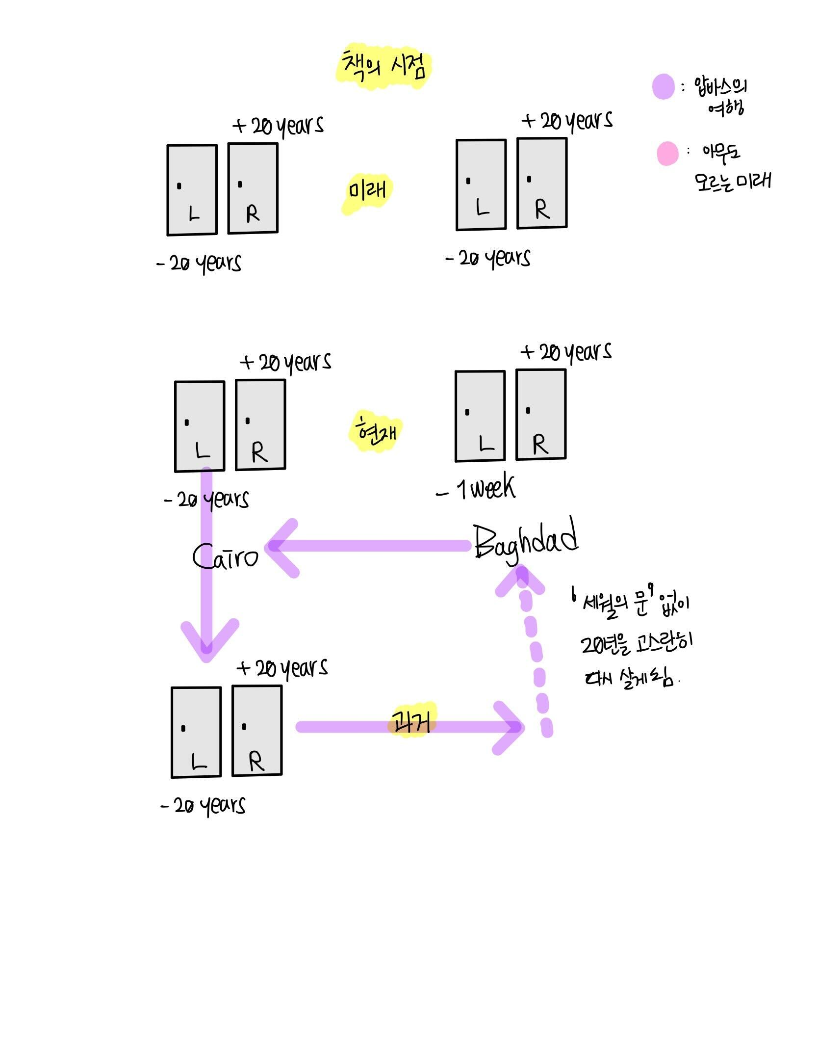 첫 시작이 좋다. 이 편은 압바스가 대교주에게 바치는 자신의 과거에 대한 회고록이다. 압바스는 20년 후의 미래로 가게 될 경우, 그 미래 또한 현재일 것이다. 왜냐면 현재의 몸으로 과거를 갔고, 그 몸으로 온전히 나이가 들어 20년을 더 살았기 때문이다. 압바스가 만약 미래를 알기 위해 바그다드에 있는 '세월의 문'을 이용한다면 40년 후의 자신을 만나게 될 것이다. 그 정도 나이면 생사가 불문하긴 하지.