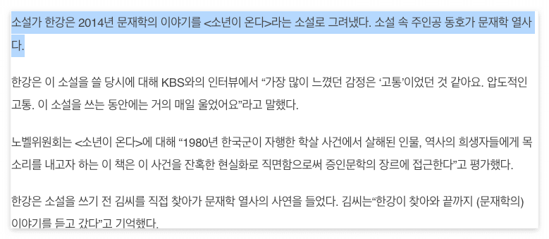 <소년이 온다>는 실제 인물 문재학 열사의 이야기를 모티브로 했다. 사실 한강 작가는 광주 출신 작가였고, 광주에서 서울로 이사가고 몇 개월 뒤에 5.18 광주 민주 항쟁이 벌어졌다. 잔인한 인간과 선한 인간이 공존하는 이 사건에 의구심을 갖게 되었고, 한강 작가는 여러 사람들을 만나며 인터뷰를 하기 시작했다. 실제로 작가는 이 작품을 쓴 이후, 본인 스스로 너무 힘들었다고 했다.