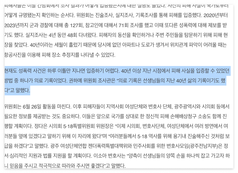 추가로, 당시 성폭력 피해자들이 용기를 내어 44년만에 그 때의 일을 털어놓았다. 먼 것 같이 느껴지는 역사는 아직도 가까운 곳에서 고통으로 몸부림 치는 잔재들이 남아있다는 것을 알 수 있다.